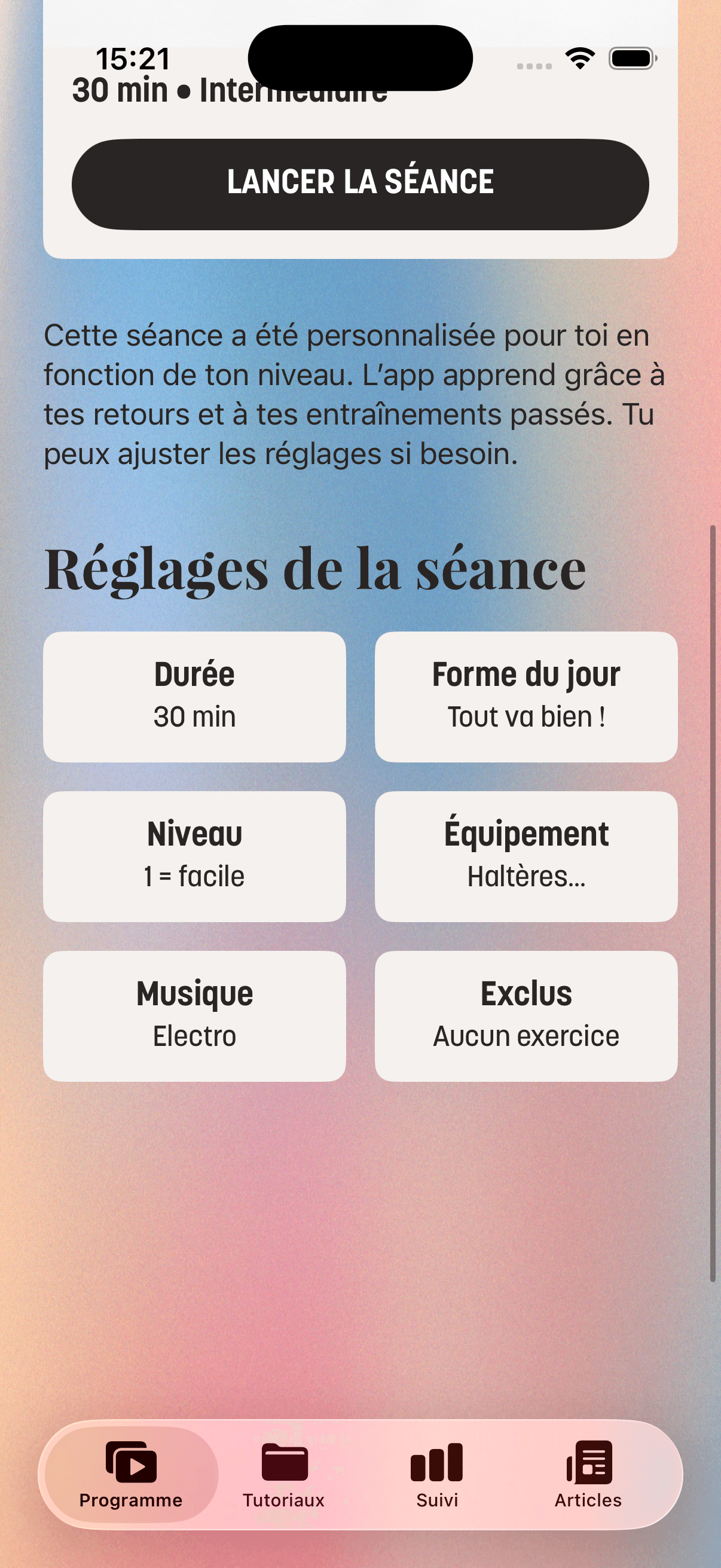 Choisis ta durée, ton niveau, ton équipement, ta musique, ta forme du jour et c’est parti ! L’app apprend grâce à tes retours.