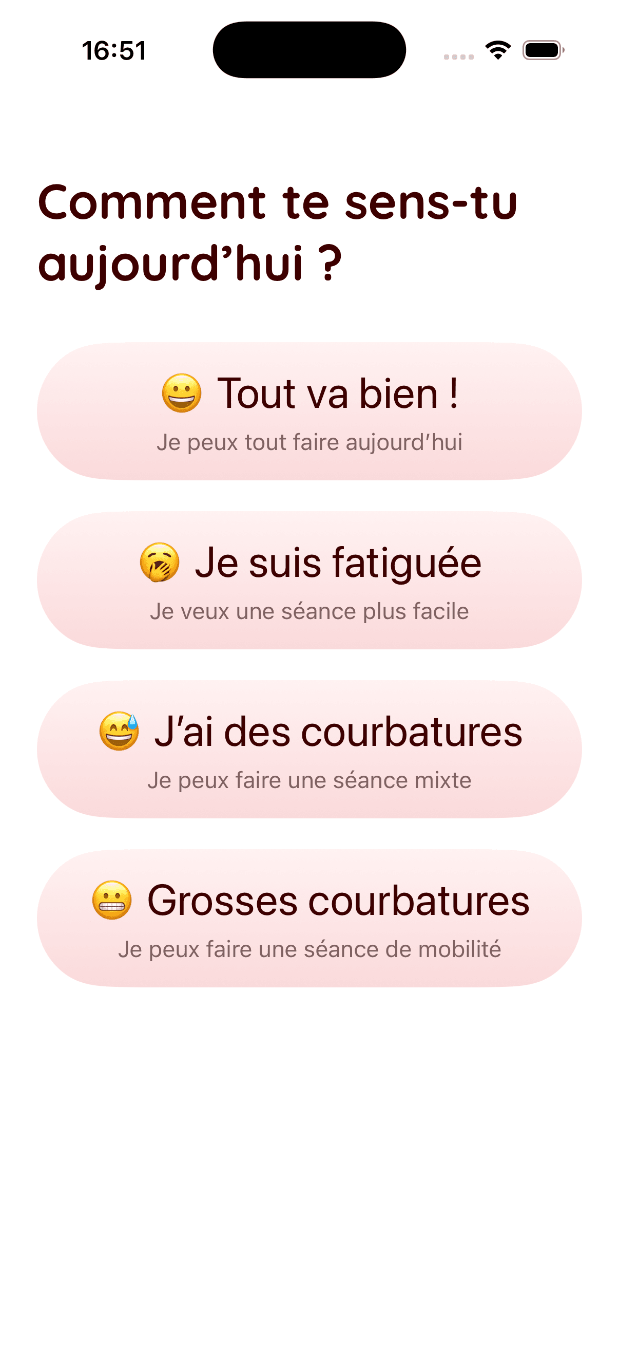 On a toutes des jours où on se sent moins bien. Plutôt que de zapper ta séance, nous te proposerons des exercices adaptés.