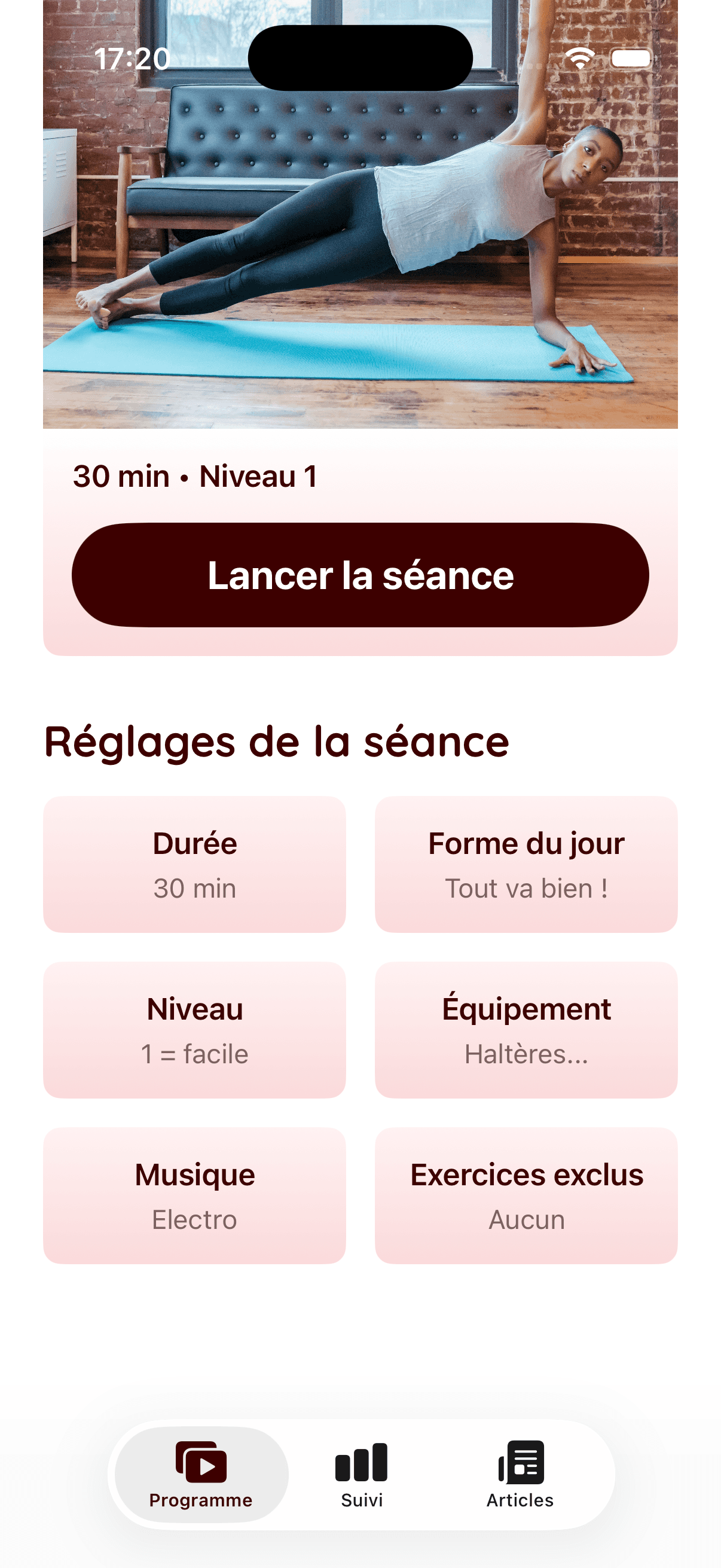 Tu peux également choisir ton niveau, ton matériel et ta musique ! Pas besoin de chercher ce que tu dois faire, un programme complet de renforcement et de mobilité est créé pour toi.